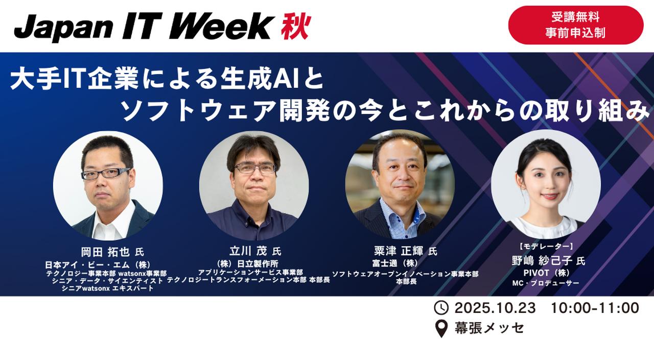10月22日(水)-24日(金)に開催される「Japan IT Week 秋」にて開催されるパネルディスカッション「大手IT企業による生成AIとソフトウェア開発の今とこれからの取り組み」に、株式会社日立製作所 アプリケーションサービス事業部 テクノロジートランスフォーメーション本部の立川茂がパネリストとして登壇します。